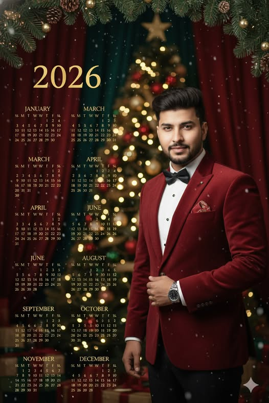 Use the uploaded reference photo as the main subject. Match the person’s face one to one with the reference image. Do not stylise, beautify, exaggerate, or alter facial features or identity in any way. Only adjust lighting and colour to fit the scene. Create a high-resolution 2026 Christmas-themed calendar poster with a premium, elegant aesthetic. The reference person stands on the right side of the composition, wearing a refined Christmas outfit such as a deep red velvet dress or tailored festive attire with subtle gold accents. The look is classy and timeless, not cartoonish or novelty. Expression is calm, confident, and warm, suitable for a luxury Christmas campaign.