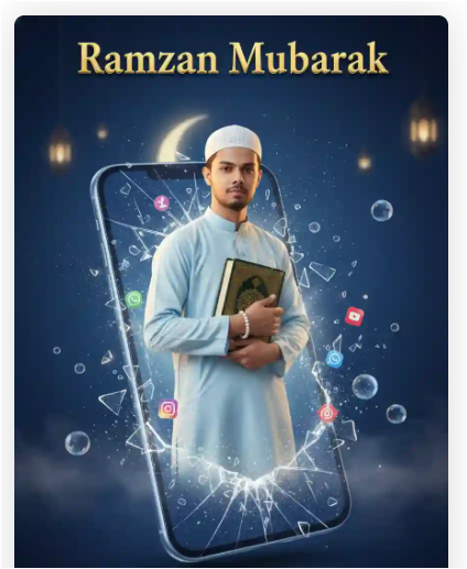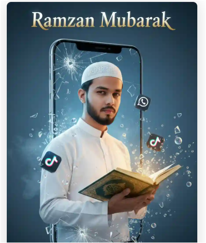 IMPORTANT – FACE LOCK (ABSOLUTE & NON-NEGOTIABLE) Use the uploaded reference image as the ONLY facial identity source. Face must remain EXACTLY identical: Same jawline Same eye shape Same nose structure Same lips Same beard pattern (if present) Same skin tone Same natural expression No beautification No smoothing No AI reinterpretation No cartoon styling No illustration effect Skin must show: Natural pores Real light reflection Human texture Zero plastic or animated look The subject must look like a real photographed human. SCENE DESCRIPTION Ultra-realistic cinematic 8K vertical portrait. A stylish young Muslim boy emerging out of a cracked smartphone screen as if stepping into the real world. The shattered glass pieces float around him in slow motion, reflecting soft blue ambient light. He is wearing: • A clean white kurta • White Islamic prayer cap (taqiyah/topi) • Minimal modest styling He is calmly holding an open Qur’an with visible golden Arabic calligraphy details. Around him: 3D floating social media icons (Instagram, WhatsApp, TikTok, YouTube) breaking apart and flying away like crystal fragments — symbolizing digital detox during Ramadan. Crystal bubbles and subtle smoke effects drifting around. EXPRESSION & MOOD Calm Spiritual Focused Peaceful Ramadan energy Soft confident look toward camera. LIGHTING Soft cinematic blue background glow. Warm golden light reflecting from Qur’an pages. Subtle rim light around shoulders. Realistic volumetric smoke lighting. No artificial HDR over-processing. CAMERA & QUALITY Mid-shot vertical framing. Eye-level angle. 85mm lens realism. Ultra HD clarity. Sharp facial focus. Extreme depth of field separation (natural, not artificial blur). 8K photoreal quality. TEXT ELEMENT Add bold cinematic text at top: “Ramzan Mubarak” Text style: Elegant modern Arabic-inspired typography Gold + soft white gradient Soft glow effect Not fully capital letters Balanced highlight but not overpowering NEGATIVE PROMPT (STRICT) cartoon, anime, CGI face, illustration style, oversharpened HDR, plastic skin, fake lighting, distorted hands, extra fingers, low resolution, watermark (except signature), blurry text. TEXT / SIGNATURE Add “Geminiaiprompt.in” at the bottom-left corner, HANDWRITTEN SIGNATURE-STYLE typography, thin cursive strokes, small size, subtle premium elegance, white or soft off-white color. ASPECT RATIO • 3:4 vertical