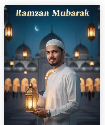 IMPORTANT – FACE LOCK (ABSOLUTE & NON-NEGOTIABLE) Use the uploaded reference image as the ONLY facial identity source. Face must remain EXACTLY identical: • Same jawline • Same cheekbone structure • Same eye spacing • Same nose shape • Same lips • Same beard / stubble pattern • Same hairline • Same natural expression Do NOT: Beautify Smooth skin Sharpen unnaturally Change age Change symmetry Modify proportions Skin must show: Natural pores Realistic texture Natural oil reflection True human imperfections Identity accuracy is higher priority than lighting or background. SCENE DESCRIPTION Ultra-realistic 8K cinematic Ramadan night portrait inside a grand mosque courtyard. The subject stands confidently in front of softly glowing mosque domes and crescent moon in the sky. He is wearing: • Elegant white thobe • Clean white prayer cap (topi) • Minimal silver wristwatch • Subtle tasbih wrapped around one hand He is standing upright, slightly angled to the right. One hand holding a traditional glowing Ramadan lantern. Other hand resting calmly near chest. EXPRESSION & BODY LANGUAGE Soft calm smile Peaceful confident eyes Relaxed shoulders Spiritual grounded presence BACKGROUND Large mosque arches Warm golden lanterns hanging symmetrically Deep blue Ramadan night sky Soft crescent moon glow Subtle crowd blur far behind LIGHTING Warm golden lantern light illuminating face softly Cool blue ambient moonlight balancing shadows Natural soft shadows No artificial HDR glow CAMERA & QUALITY Waist-up framing Eye-level camera 85mm DSLR realism Ultra sharp facial focus High dynamic range True-to-life skin tones No blur on face Professional photography finish TEXT ELEMENT Add bold cinematic headline at top: Ramzan Mubarak Style: Elegant Islamic font Gold + white gradient Soft glow effect Balanced highlight NEGATIVE PROMPT (STRICT) cartoon face, anime style, CGI skin, plastic texture, oversharpened HDR, face swap error, distorted hands, extra fingers, artificial glow, low resolution, watermark (except signature), logo distortion. TEXT / SIGNATURE Add “Geminiaiprompt.in” at the bottom-left corner, handwritten signature-style typography, thin cursive strokes, small size, subtle premium elegance, white or soft off-white color. ASPECT RATIO • 3:4 vertical
