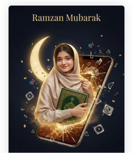 IMPORTANT – FACE LOCK (ABSOLUTE & NON-NEGOTIABLE) Uploaded reference image must be the ONLY identity reference. Maintain 100% identity accuracy: Same facial proportions Same hairline Same skin tone Same real expression Same human detail No beautification No face swap No AI modification No animated skin Face must appear completely natural and human. SCENE DESCRIPTION Ultra-realistic cinematic digital scene. A young Muslim boy stepping forward through a glowing smartphone screen portal. The phone is tilted slightly, glass cracked dramatically with light rays shining from inside. He wears: • Soft pastel kurta (light sky blue) • White prayer cap (topi) • Simple wrist tasbih beads He holds the open Qur’an close to his chest. Floating around him: Broken holographic social media icons dissolving into particles. Glowing digital fragments fading into light dust. Crystal bubbles reflecting Ramadan lantern shapes. BACKGROUND Deep blue Ramadan night gradient background. Subtle crescent moon glow behind him. Soft floating lantern bokeh in distance. Gentle smoke and light particles. EXPRESSION Serene Spiritual Mature calm Slight soft smile LIGHTING Cool blue ambient tone. Warm golden highlight from Qur’an pages. Soft rim light outlining cap and shoulders. Natural skin illumination. CAMERA & QUALITY Vertical mid-to-full body framing. 35mm cinematic lens. Ultra sharp focus on face. True-to-life skin texture. 8K HDR photorealistic quality. No artificial rendering look. TEXT ELEMENT Add bold cinematic Ramadan headline: “Ramzan Mubarak” Style: Gold embossed look Soft glow Elegant Islamic font style Placed near upper center Clearly readable NEGATIVE PROMPT (STRICT) AI face look, cartoon texture, anime style, plastic skin, distorted body, unrealistic lighting, fake glow, oversaturated colors, watermark (except signature), logo distortion, low quality. TEXT / SIGNATURE Add “Geminiaiprompt.in” at the bottom-left corner, HANDWRITTEN SIGNATURE-STYLE typography, thin cursive strokes, small size, subtle premium elegance, white or soft off-white color. ASPECT RATIO • 3:4 vertical