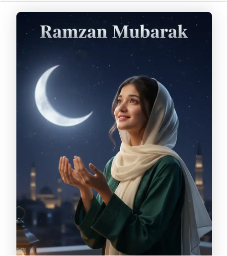 IMPORTANT – FACE LOCK (ABSOLUTE & NON-NEGOTIABLE) Use the uploaded reference image as the ONLY facial identity source. Face must match 100% exactly: • Same bone structure • Same jawline • Same cheek contour • Same eye shape and spacing • Same nose and lip structure • Same skin tone • Same natural expression • Same hairline Do NOT beautify. Do NOT smooth skin. Do NOT modify facial symmetry. No AI reinterpretation. Preserve: Natural pores Real skin texture Subtle imperfections Authentic human lighting response Identity accuracy has highest priority. SCENE DESCRIPTION Ultra-realistic cinematic Ramadan night portrait. A young Muslim woman standing on a rooftop terrace under a large glowing crescent moon. She wears a soft ivory silk hijab and a deep emerald abaya with subtle embroidery details visible in 8K clarity. Pose: She stands slightly turned sideways. Both hands raised gently in dua. Head slightly tilted upward toward the moon. Body posture calm and composed. The wind lightly moves the edge of her hijab for natural realism. EXPRESSION Peaceful Emotionally spiritual Soft closed-lip smile Eyes gently lifted toward sky Serene Ramadan mood BACKGROUND Night skyline with distant mosque silhouette. Soft glowing minarets in background. Star-filled sky with realistic depth. Large crescent moon casting cool silver light. Subtle floating dust particles illuminated by moonlight. Color palette: Deep navy + silver moonlight + emerald tones. LIGHTING Primary cool moonlight from upper right. Soft warm lantern glow from lower left. Natural shadow falloff. No artificial HDR glow. True photographic lighting behavior. Skin must look human, not rendered. CAMERA & QUALITY 85mm prime lens realism Shallow depth of field Face ultra sharp Background softly separated naturally No fake blur 8K resolution True DSLR quality No overprocessing TEXT ELEMENT Top center text: Ramzan Mubarak Style: Elegant bold serif typography Soft silver gradient Subtle glow Premium cinematic placement NEGATIVE PROMPT (STRICT) cartoon, anime, CGI skin, 3D render look, plastic texture, beauty filter, oversharpening, artificial glow, face swap error, distorted hands, extra fingers, low resolution, watermark (except signature), logo distortion, unnatural lighting, AI smooth skin. TEXT / SIGNATURE Add “Geminiaiprompt.in” at the bottom-left corner, HANDWRITTEN SIGNATURE-STYLE typography, thin cursive strokes, small size, subtle premium elegance, white or soft off-white color. ASPECT RATIO • 3:4 vertical