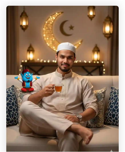 IMPORTANT – FACE LOCK (ABSOLUTE IDENTITY PRESERVATION) Use the uploaded reference image as the ONLY identity source for the real man. The face must match 100% exactly. Do NOT change facial structure, jawline, eye shape, nose, lips, beard pattern, hairline, age, or skin tone. No beautification, no smoothing, no face reshaping, no AI reinterpretation. Preserve real skin texture, visible pores, natural beard strands, and authentic facial asymmetry. Ultra-HD sharp focus on the face is mandatory. The person must be instantly recognizable. SCENE DESCRIPTION Create a full-body ultra-realistic comedic Ramadan-themed portrait inside a cozy living room decorated for Ramadan. The real man is sitting comfortably on a soft couch, slightly leaning back with a relaxed posture. Beside him sits a clearly stylized cartoon character (from a separate reference image), but the real man must remain 100% photorealistic and natural — no blending of cartoon style onto his face or skin. The mood is playful, warm, and family-friendly. POSE DETAILS • The man sits with one leg crossed casually • One hand holding a cup of tea or dates • The other hand resting on his knee • Slight humorous smile, natural expression • Eyes looking at camera confidently The cartoon character is sitting beside him in a funny pose, looking cheerful. OUTFIT DETAILS • Modern Ramadan-style galabeya (soft beige or pastel tone) • Light embroidery on collar • Clean white prayer cap • Simple wristwatch Fabric must look real with natural folds and cloth texture. BACKGROUND & ENVIRONMENT • Warm Ramadan lanterns glowing softly • Crescent moon decor on wall • Subtle fairy lights • Decorative Islamic geometric cushions • Cozy indoor setting The atmosphere must feel festive but natural — not exaggerated or fantasy-like. LIGHTING • Soft warm indoor lighting • Balanced exposure on face • Natural skin highlights • No artificial glow • No heavy blur Skin must look fully human — no plastic texture. CAMERA & QUALITY • 85mm DSLR lens look • Full-body portrait • Eye-level angle • Ultra sharp focus • 8K resolution • True photographic realism NEGATIVE PROMPT Cartoon skin on real man, anime style, CGI texture, plastic face, over-smooth skin, exaggerated lighting, distorted hands, extra fingers, AI artifacts, watermark (except signature), logo distortion. TEXT / SIGNATURE Add “tezupdate.in” at the bottom-left corner, HANDWRITTEN SIGNATURE-STYLE typography, thin cursive strokes, small size, subtle premium elegance, white or soft off-white color. ASPECT RATIO • 3:4 vertical