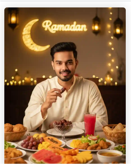 IMPORTANT – FACE LOCK (STRICT 100% MATCH) The uploaded reference image must be used as the exclusive facial identity source. Face must remain 100% identical. No face reshaping, no smoothing, no beautification, no AI modification. Maintain natural pores, beard density, skin tone, and real human texture. Ultra-HD clarity and razor-sharp facial detail required. SCENE DESCRIPTION Create a hyper-realistic cinematic Iftar celebration scene inside a warmly decorated dining space. The young Muslim man is sitting at a dining table full of abundant Iftar food in front of him. The table includes: • Large fruit platter (watermelon, papaya, grapes, apples) • Dates in crystal bowl • Fresh cut mango slices • Rooh Afza drink in glass • Fried snacks (samosa, pakora) • Fresh bread and salad • Small bowl of soup Food must look detailed, glossy, and realistic with natural highlights. POSE DETAILS • Sitting upright at dining table • Holding a date in one hand • Other hand resting naturally on table • Soft genuine smile • Looking directly at camera • Friendly and warm expression Moment just about to break fast. OUTFIT DETAILS • Light pastel kurta (cream or soft grey) • Neatly styled hair (same as reference) • Simple modest look • Clean and elegant appearance Clothing texture must be natural and realistic. BACKGROUND & ENVIRONMENT • Elegant Ramadan decor • Crescent moon wall decoration • Hanging lanterns • Warm golden fairy lights • Subtle evening ambiance The environment must feel festive but natural. LIGHTING • Balanced warm ambient light • Slight golden sunset glow • Natural skin tone preservation • No harsh shadows • No unrealistic glow Face must appear completely human and photorealistic. CAMERA & QUALITY • Medium waist-up portrait • 50mm lens realism • DSLR photography look • Ultra-HD sharp focus • 8K clarity • True-to-life color grading NEGATIVE PROMPT Anime face, cartoon look, CGI texture, plastic skin, distorted anatomy, extra limbs, oversaturation, heavy blur, watermark (except signature), logo distortion. TEXT / SIGNATURE Add “tezupdate.in” at the bottom-left corner, HANDWRITTEN SIGNATURE-STYLE typography, thin cursive strokes, small size, subtle premium elegance, white or soft off-white color. ASPECT RATIO • 3:4 vertical.