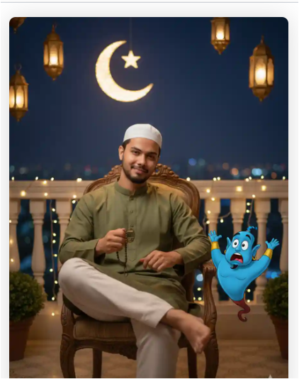 IMPORTANT – FACE LOCK (STRICT) The uploaded image must be used as the exclusive identity reference. Face must remain 100% identical with zero deviation. No reshaping, no beautification, no smoothing, no facial modification. Maintain real beard density, natural skin texture, pores, and authentic human imperfections. Ultra-HD clarity and sharp facial detail required. SCENE DESCRIPTION Create a full-body ultra-realistic comedic Ramadan portrait set on a decorated balcony at night. The real man is seated on a decorative chair with a relaxed and slightly playful expression. Next to him stands or sits a cartoon character (from separate reference), clearly in animated style — but the real man remains completely photorealistic. The vibe is light, joyful, and Ramadan festive. POSE DETAILS • The man sitting casually • One elbow resting on armrest • Holding digital tasbeeh in one hand • Slight playful grin • Head tilted slightly to one side • Eyes directly looking at camera Cartoon character reacting humorously beside him. OUTFIT DETAILS • Modern modest Ramadan outfit (light grey or olive tone kurta) • Simple white pajama • Subtle embroidered cap • Clean and neat appearance Clothing must show realistic stitching, natural folds, and authentic fabric weight. BACKGROUND & ENVIRONMENT • Night sky with visible crescent moon • Hanging Ramadan lanterns • City lights softly glowing in background • Warm fairy lights around balcony railing • Soft breeze effect on clothing Must feel real and grounded — not fantasy. LIGHTING • Balanced moonlight + warm lantern glow • Soft shadows • Natural skin tone preservation • No overexposure • No dramatic unrealistic glow Face must look completely human and natural. CAMERA & QUALITY • Medium-wide full-body shot • 50mm lens realism • DSLR photography look • Ultra-HD sharp focus • 8K clarity • No artificial blur NEGATIVE PROMPT Cartoon blending on real face, anime skin, plastic texture, CGI appearance, distorted anatomy, low resolution, over-saturated colors, unrealistic lighting, watermark (except signature), logo artifacts. TEXT / SIGNATURE Add “tezupdate.in” at the bottom-left corner, HANDWRITTEN SIGNATURE-STYLE typography, thin cursive strokes, small size, subtle premium elegance, white or soft off-white color. ASPECT RATIO • 3:4 vertical.