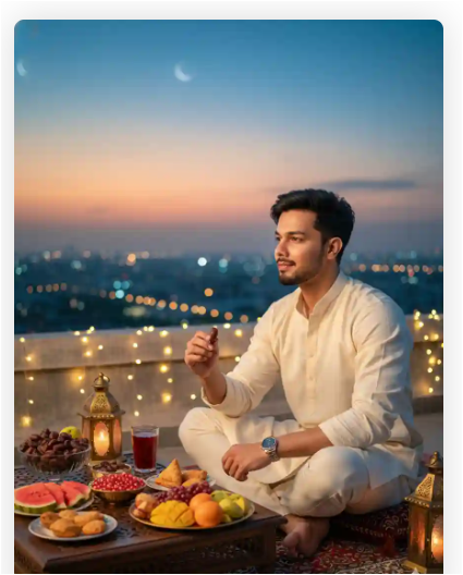 IMPORTANT – FACE LOCK (ABSOLUTE IDENTITY LOCK) Use the uploaded reference image as the ONLY facial identity source. The face must match 100% exactly with zero deviation. Do NOT change facial structure, jawline, eye shape, nose, lips, beard pattern, hairstyle, skin tone, or age. No beautification, no smoothing, no AI enhancement. Preserve real skin pores, beard texture, natural asymmetry, and authentic expression. Ultra-HD sharp facial clarity is mandatory. The person must be instantly recognizable as the same individual. SCENE CONCEPT Create an ultra-realistic cinematic Ramadan rooftop Iftar scene at sunset. The young Muslim man is seated on a stylish rooftop setting overlooking a glowing city skyline. The sky has a soft orange-to-deep-blue sunset gradient with a visible crescent moon beginning to appear. In front of him is an elegant low wooden Ramadan table setup decorated with: • Crystal bowl of premium dates • Sliced watermelon and mango • Pomegranate bowl • Fresh fruit platter • Rooh Afza drink in glass • Traditional lantern (fanous) glowing warmly • Small golden tray with samosas and pakoras Food must look hyper-detailed and photorealistic with natural reflections. POSE DETAILS • Sitting cross-legged on a decorative rug • One hand holding a date gently • Other hand resting on knee • Soft confident smile • Eyes looking toward the horizon Expression: Calm, grateful, peaceful anticipation before breaking fast. OUTFIT DETAILS • Elegant cream-colored kurta • Slim tailored pajama • Minimal luxury wristwatch • Neatly styled hair (same as reference) Fabric texture must show realistic cotton folds and natural drape. BACKGROUND & ATMOSPHERE • Rooftop lantern lights • Hanging Ramadan fairy lights • City skyline slightly blurred naturally (not artificial blur) • Soft breeze effect in clothing Mood: Premium, peaceful, modern Ramadan aesthetic. LIGHTING • Golden sunset rim light • Soft ambient blue evening fill light • Balanced exposure on face • Natural skin tone preservation • No artificial glow Skin must look fully human, natural, and ultra-sharp. CAMERA & QUALITY • 85mm DSLR lens look • Medium full-body framing • Eye-level cinematic angle • 8K resolution • Extreme clarity • Zero blur on face NEGATIVE PROMPT Cartoon, anime, CGI look, plastic skin, over-smooth face, unrealistic glow, distorted hands, extra fingers, heavy blur, watermark (except signature), logo distortion. TEXT / SIGNATURE Add “tezupdate.in” at the bottom-left corner, HANDWRITTEN SIGNATURE-STYLE typography, thin cursive strokes, small size, subtle premium elegance, white or soft off-white color. ASPECT RATIO • 3:4 vertical.