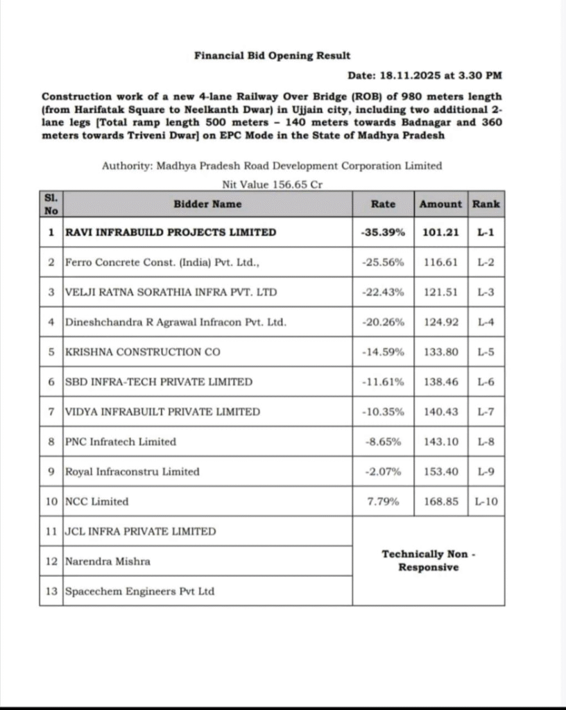 Ravi Infrabuild Becomes L1 Bidder for Ujjain 4-Lane ROB Project – MPRDC Releases Financial Bid Results
