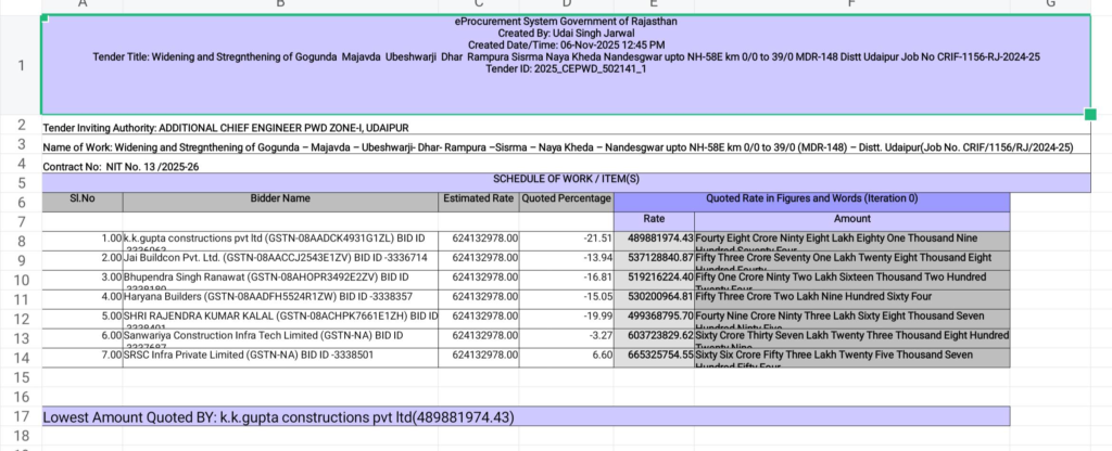 📌 Tender Result Summary – Widening & Strengthening Project (Rajasthan)