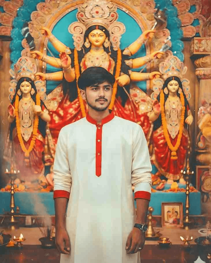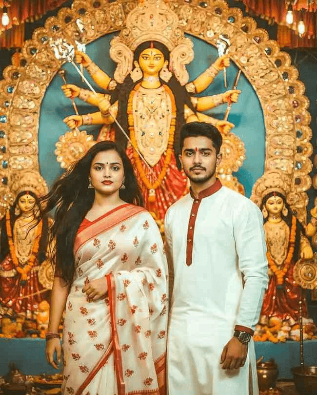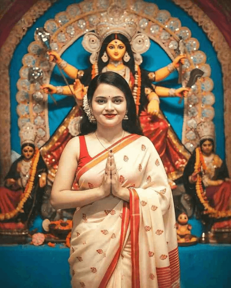 - Festive Perfect – Maa Durga idol + traditional dress + retro lighting.