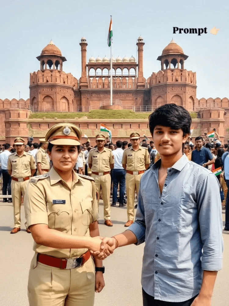 “A young man shakes hands with a female Indian police officer outside Lal Kila. The crowd behind cheers. Sunlight glows on their faces, symbolizing respect and pride.”