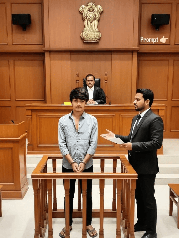 “A boy stands in a courtroom dock as a defendant. He wears his original outfit and expression. Two lawyers argue; the judge observes. Handcuffed hands in focus.”