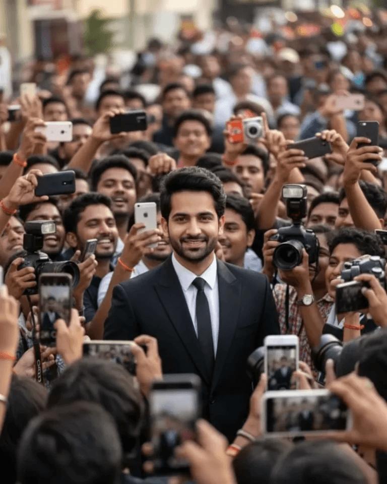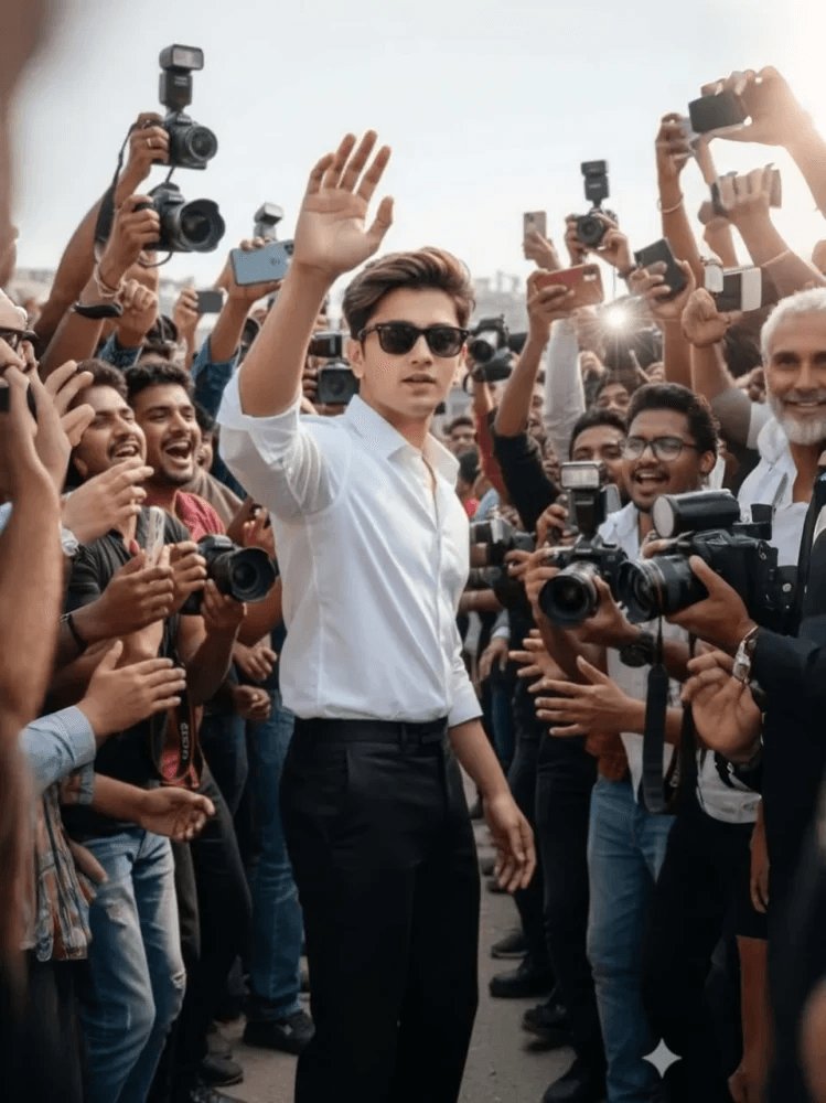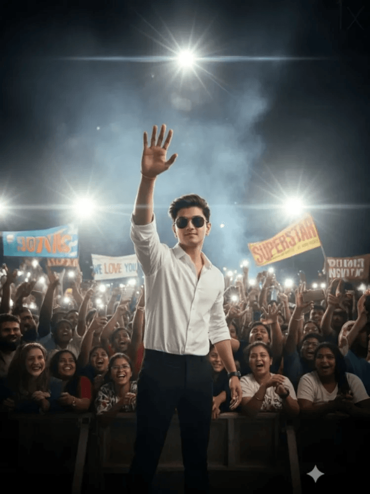 “Low-angle cinematic shot of a 5’2″ tall man wearing white shirt, black pants, and sunglasses. Standing in a cheering crowd, people waving phones and banners. Natural light and smoky atmosphere.”