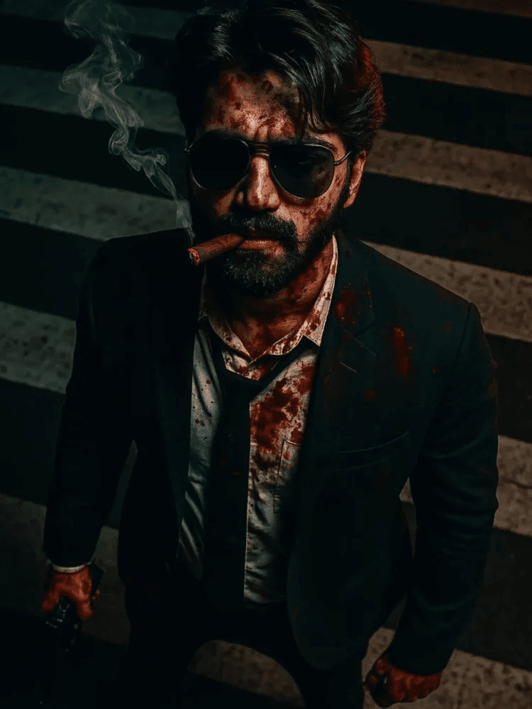 “A fierce man in a dark blue suit and bloodstained white shirt stands on a crosswalk at night, holding a pistol. Cigarette smoke swirls. Neo-noir, moody lighting, ultra-realistic 8K detail.”