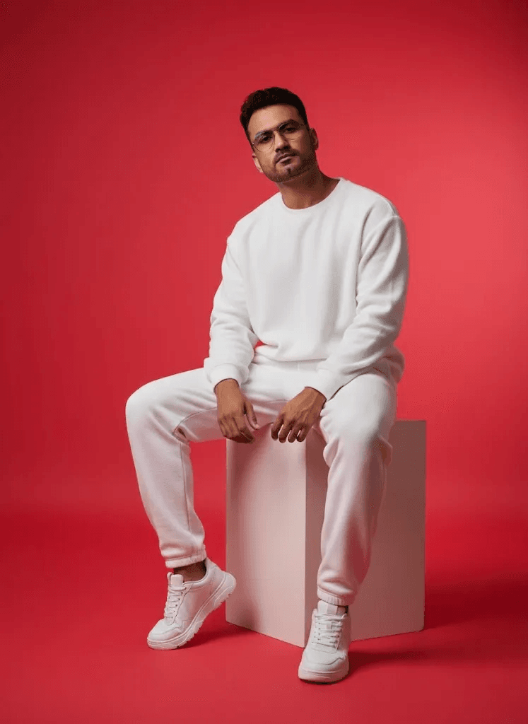 Stylish fashion editorial photo of a male model wearing an oversized white sweatshirt and white sweatpants, paired with white sneakers. A soft red studio backdrop with soft cinematic lighting, highlighting textures, futuristic editorial style, model sitting elegantly, head slightly tilted, relaxed posture.