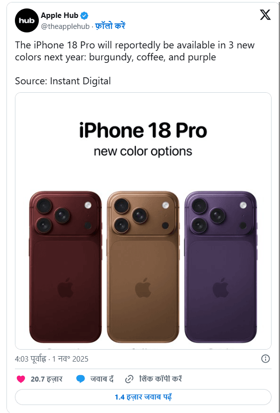 iPhone 17 सीरीज के बाद से अब Apple फैन्स iPhone 18 सीरीज का इंतजार कर रहे हैं। लॉन्च से पहले इस सीरीज से जुड़ी लीक्स ऑनलाइन सामने आने लगी है। हाल ही में फोन के कलर ऑप्शन से जुड़ी जानकारी सामने आई थी। जहां इस बार कंपनी ने iPhone 17 Pro मॉडल्स को Cosmic Orange कलर ऑप्शन में पेश किया था। वहीं, iPhone 18 Pro को कंपनी नए Burgundy, coffee और purple कलर ऑप्शन में पेश कर सकती है। यहां जानें iPhone 18 Pro से जुड़ी सभी डिटेल्स।
