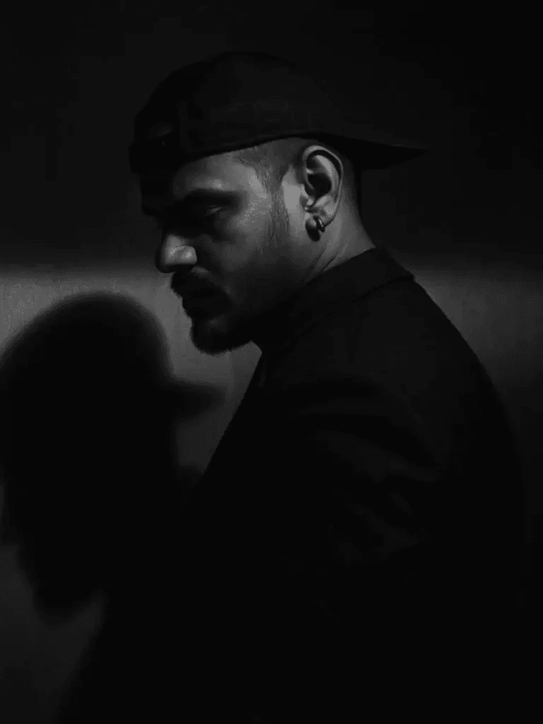 convert this image into a photorealistic, high-contrast black-and-white portrait of a man standing confidently on a staircase. Wearing Cap backwords,He is wearing a loose, white shirt with the sleeves rolled up, revealing a toned physique. The lighting is dramatic, with a single strong light source from above casting deep shadows across his face and body, obscuring his facial features in silhouette. The background is a deep, absolute black, enhancing the quality . Make it Ultra Realistic realism