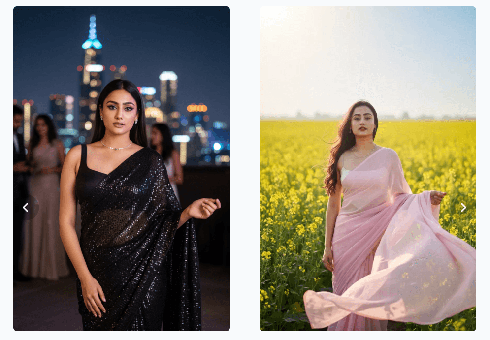 Use soft lighting, minimalist backdrops, and expressive poses to make your saree shots stand out. Add a warm, vintage filter in Gemini for that “old Bollywood charm.”