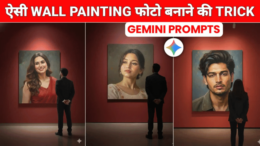 First of all, people make this type of photo hanging on the wall and then convert it into a video using any video editing app. Then they upload it on Instagram. So friends, we are also going to do the same here. First of all, we will make this type of wall painting AI photo here. After that, we will convert it into a video here. First of all friends, let me tell you about it. People are making it in different ways. Girls are also making such photos, and boys are also making such photos. If there is a girl in the photo hanging on the wall, then a boy is standing and looking at her. If there is a boy in the photo hanging on the wall, then a girl is standing and looking at him. In this way, this photo looks very amazing. First of all friends, we are going to create this type of photo here, and we will make it using Google Gemini.